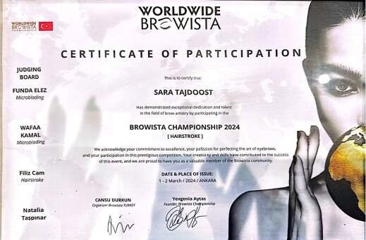 در مسیر تخصصی خود در حوزه آرایش دائم، با تکیه بر دانش روز، تجربه بینالمللی و تعهد به کیفیت، موفق به کسب افتخاراتی شدهام که نهتنها نشاندهنده مهارت فنی، بلکه گواهی بر اعتبار جهانی برند سارا تاج است
