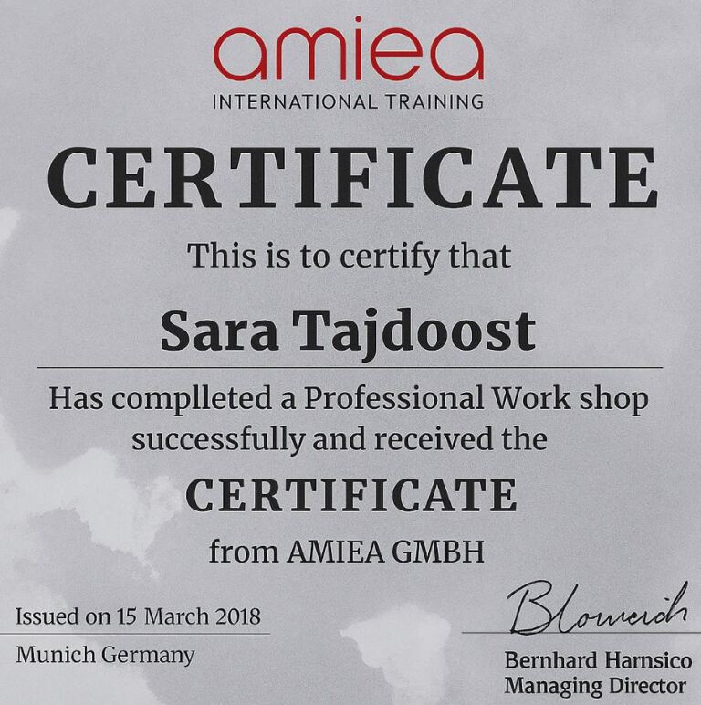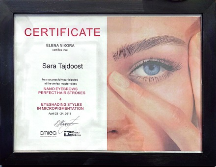 در ادامه مسیر تخصصی و بینالمللی خود، در مسترکلاس اختصاصی النا نیکورا، مستر برجسته برند آلمانی amiea، شرکت کردم. این دوره شامل آموزش تکنیکهای پیشرفته مانند Hairstroke Evolution و Shaded Eyeliner بود که در کنار سایر افتخاراتم، پایهگذار کیفیت جهانی خدمات سارا تاج شدهاند.