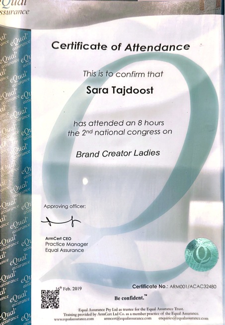 این اجلاس با هدف تجلیل از بانوان تأثیرگذار در حوزه کارآفرینی و برندینگ برگزار شد. دریافت لوح تقدیر از این رویداد، نشاندهنده نقش فعال من در توسعه برند زیبایی و آموزش تخصصی در ایران بود